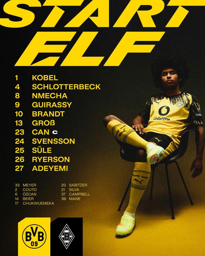 多特首發(fā):1-科貝爾、24-斯文松、4-施洛特貝克、25-聚勒、26-瑞爾森、23-埃姆雷-詹、8-恩梅加、10-布蘭特、13-格羅斯、27-阿德耶米、9-吉拉西